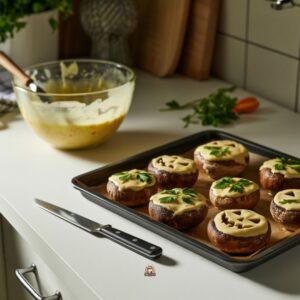 - Arrange the mushrooms on the baking sheet, ensuring they’re spaced out evenly.